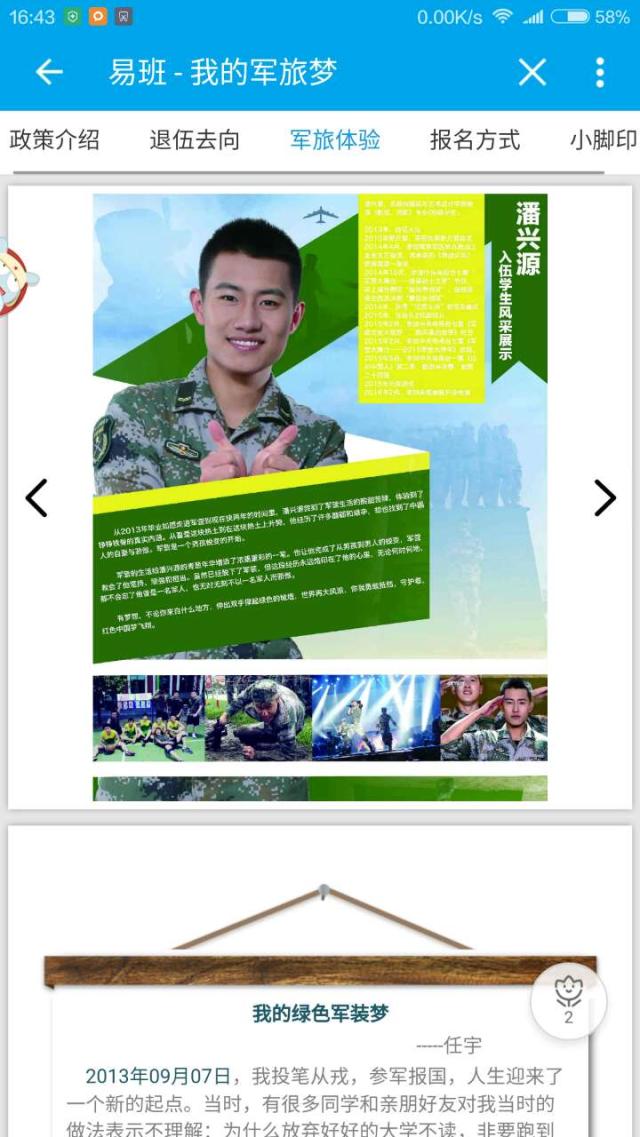 熊朝成的心中一直有一个绿色的军营梦,他希望大学时光能有增添一抹迷彩色,经过在线咨询武装部的姚洁老师,他在易班网上郑重选择了“应征入伍”预报名,希望能够在入学后应征入伍,去部队锻炼体魄、磨炼意志。