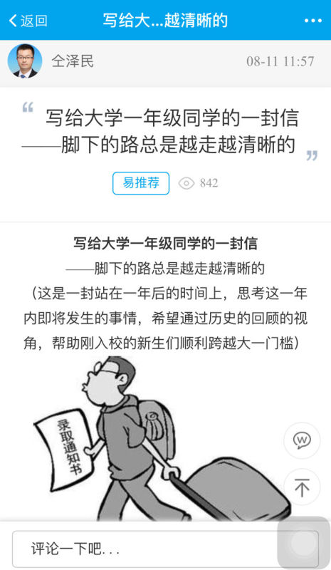 “‘易’起成长”系列活动,不仅有辅导员答疑解惑,还有新生辅导员情真意切地写给大一新生的博文,环境学院新生辅导员仝泽民发表的博文《写给大学一年级同学的一封信——脚下的路总是越走越清晰》阅读量在5天内超过了1200人次,网名“之夏”的同学留言说“很赞,提前让我熟悉了大学生活,帮我解决了心头的疑惑。”。