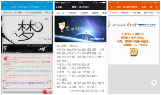 为了让新生更好地了解校园生活,东华易班网还推出了各类大学生喜闻乐见的线上活动共20余项。在东华易班首页,“易迎新”系列专题,汇集了学校、专业介绍、交通指南、生活指南等方面的实用攻略,通过“做任务、赢网薪、换礼品”的形式,让新同学尽快熟悉易班操作,融入大学的网络生活。