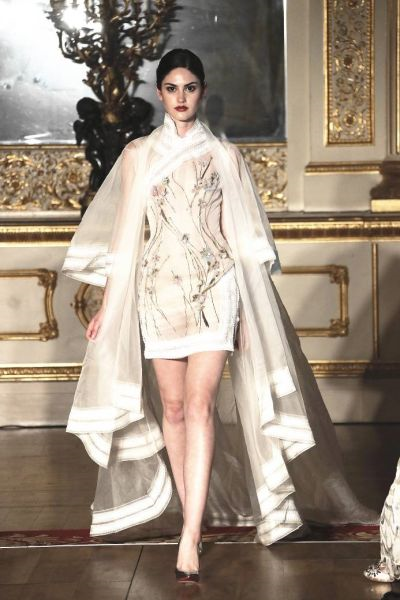 美籍华人时装设计师、APEC会议领导人服装主要创作成员、GRACECHEN品牌创始人陈野槐谈到,中国文化的本质是深刻、宏大、智慧的,她用静、深、富来概括以中国文化为根源的普世审美观。陈野槐此次展览作品主题是LandscapeofHearts内心风景,本系列作品以西式剪裁审美加以中式精妙工艺点睛,勾勒出中国女性独特的优雅曼妙线条之美与气质,意欲解读与塑造一种全新的东方女性形象。设计风格中西合璧、刚柔相济、大气优雅。工艺上,在娴熟运用立体裁剪的基础之上,将编织、流苏、立体盘花,甚至少数民族的锡绣、马尾绣等,巧妙地融入到高定作品中。