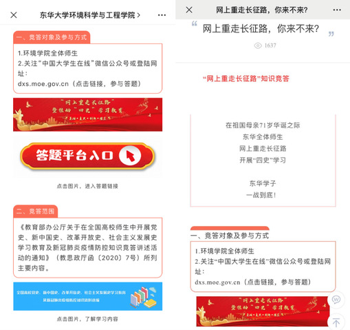 除理论学习外,学校还积极拓宽学习“长征精神”及“四史”教育的平台及渠道,从线下延伸至线上,从课内拓展到课外,引导学生将理论与实践结合,做到思想“不掉线”,行动“不止步”。结合红军长征路中的历史坐标和典型事件,学校开辟线上“全景式”活动场景,引用先烈事迹及革命场景等历史图文影像资料,打造“重走长征路”线上“云长廊”“云书屋”及“云影院”,以漫画、海报、动画等形式创作“云画展”,让大学生在全景式、浸润式“长征云游”中重温爱国心、重走长征路,感受共产党人的使命和初心。构筑线下“体验式”实践场域,组织“重走长征路”实践调研活动,前往图书馆、博物馆、革命纪念馆、革命遗址等文化教育基地“打卡学习”,在“历史回望”中学会历史思维、培养历史眼光、增强使命担当;开展“原型寻访”活动,寻访经历过重大历史事件的英雄楷模及其亲属战友,挖掘先进人物与“长征精神”的内在联系,在红色寻访中学习英雄、致敬先烈,激发青年学生用奋斗和热情坚守初心、砥砺奋进,让“长征精神”真正入脑、入耳、入心、入行。